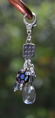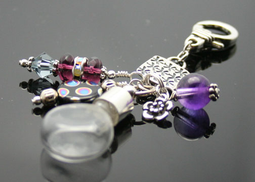 3" long, sterling silver, Swarovski crystal dangle, amethyst dangle, Czech peacock and glass crystal beads, hammered sterling silver garden and flower charm, small lobster claw. Small essential oil bottle has a screw cap. Comes with a mini-pipette in a gauze pouch. Price: $44.70 - SOLD! Please see our other aromatherapy clip-ons here.