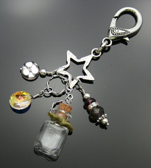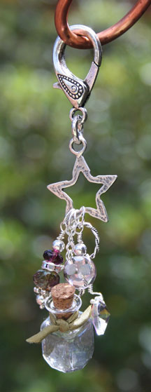 4" long, sterling silver, Swarovski crystal dangles, Czech peacock and glass crystal beads, hammered sterling silver star charm, large lobster claw. Small essential oil bottle has a natural cork top. Comes with a mini-pipette in a gauze pouch. Price: $45.80 Now on Sale $42.80