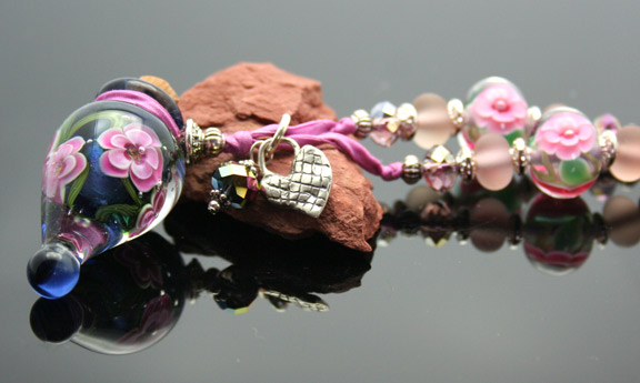 Gorgeous Artisan Glass Aromatherapy Bottle Necklaces on Hand-Dyed, Hand-Sewn, Silk Cords with Sterling Silver, Copper, Czech Beads, Zen Crystals, and Custom Lampwork Glass Beads.