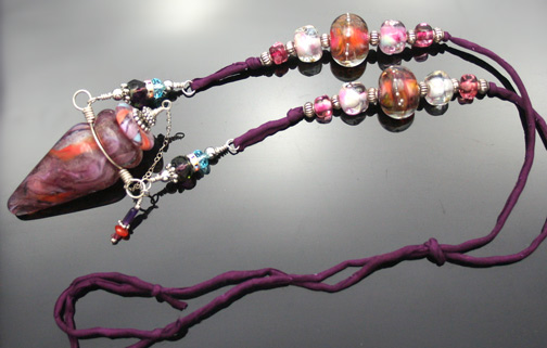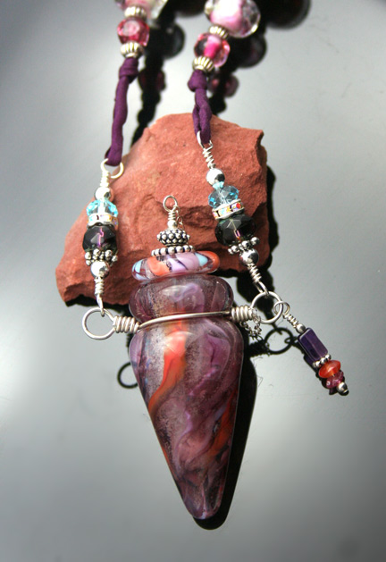 Aromatherapy Jewelry: Enigma Aromatherapy PendantBeautiful, swirling design of lavender, pinks, coral, and light blue decorate this incredible lampwork glass aromatherapy bottle necklace. It lovingly holds your favorite essential oils in its well. Just open the natural cork (which is also decorated with glass and silver) and enjoy your favorite aromatherapy oils whenever you want thoughout the day. This amazing pendant features beautiful sterling silver wire work, findings, and beads, 4 Czech crystals, an amethyst bead dangle charm, and 10 gorgeous, lampwork glass beads. It hangs from a single strand of satiny-soft, deep purple, pure silk cord that is hand-dyed and hand-sewn. The necklace is tied at the back of the neck with 2 slip knots, so you can adjust the length from 16 inches long to anything shorter. The bottle has been properly kiln annealed and cleaned and is about 2 inches tall, including the silver on the top. This Aromatherapy Necklace comes in a gauze pouch with a mini-pipette to easily add essential oils to the bottle. This aromatherapy necklace is one of our premium designs. It features 10 custom lampwork glass beads that are just beautiful - 8 organically shaped. This one-of-a-kind lampwork glass pendant is a work of art! It glows beautifully in the sunlight.