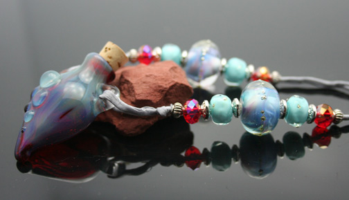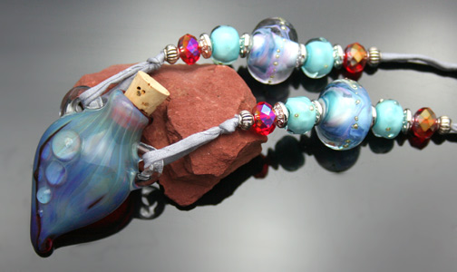 Aromatherapy Necklace: Summer Sunset Essential Oil Necklace - SOLDSky blue glass gracefully drapes over a dark pink glass aromatherapy bottle. 6 playful "bumps" sit on the front of this artisan glass aromatherapy bottle necklace. It lovingly holds your favorite essential oils in its well. Just open the natural cork and enjoy your favorite aromatics whenever you want thoughout the day. This necklace features beautiful sterling silver beads, 4 zen crystal beads, and 6 custom lampwork glass beads. It hangs from a single strand of satiny-soft, silver grey, pure silk cord that is hand-dyed and hand-sewn. The necklace is tied at the back of the neck with 2 slip knots, so you can adjust the length from 15 inches long to anything shorter. The bottle has been properly kiln annealed and cleaned and is 1 5/8" long. This Aromatherapy Necklace comes in a gauze pouch with a mini-pipette to easily add essential oils to the bottle. Price: $156.70 - ONLY 1 AVAILABLE SOLD