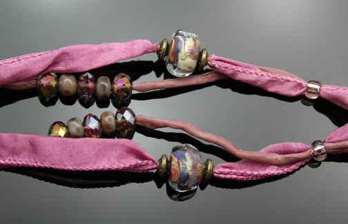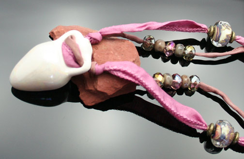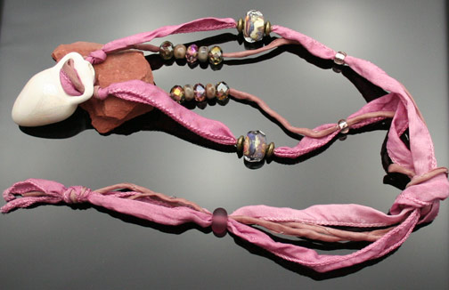 Aromatherapy Jewelry: Raku Blush Amphora PendantThis lovely, small replica of an ancient earthenware amphora has a glazed, opalescent finish on the outside. The inside has been left pourous so as to absorb and diffuse your favorite essential oil or blend throughout the day. The amphora is 1.5" in length. It adorns double starnds of super-soft, silk ribbon that has been hand dyed and sewn to a point. It is about 15 inches long and can be tied to your desired length with a simple knot. 2 "raku-inspired", organic, lampwork glass beads, 4 small lampwork glass spacer beads, 6 zen crystal beads, and 1 etched glass bead at the back of the neck finish this piece of beautiful aromatherapy jewelry. This Aromatherapy Necklace comes in a gauze pouch with a mini-pipette to easily add essential oils to the bottle.