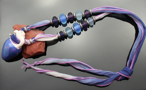 Aromatherapy Jewelry: Violet Blue Amphora PendantThis gorgeous, small replica of an ancient earthenware amphora has a glazed, opalescent blue finish on the outside. The inside has been left pourous so as to absorb and diffuse your favorite essential oil or blend throughout the day. The amphora is 1.5" in length. It adorns a blue and purple watercolor, super-soft, silk ribbon that has been hand dyed and sewn to a point. It is about 13.5 inches long and can be tied to your desired length with a simple knot. Sterling silver spacer beads, rings, and findings, 10 custom, etched, lampwork glass beads, and 1 Swarovski crystal dangle finish this piece of beautiful aromatherapy jewelry. This Aromatherapy Necklace comes in a gauze pouch with a mini-pipette to easily add essential oils to the bottle.