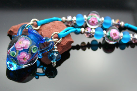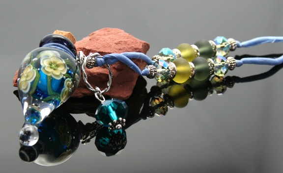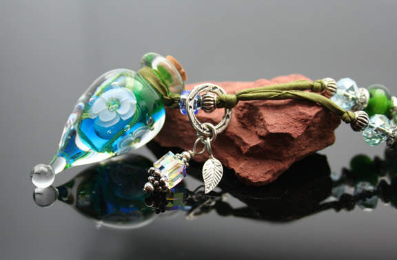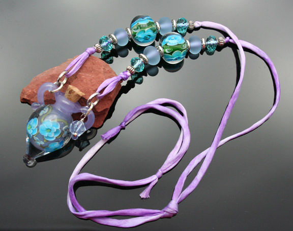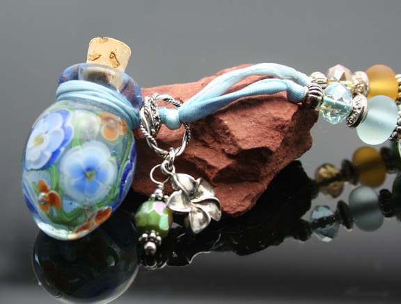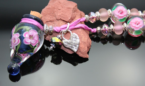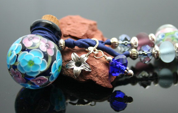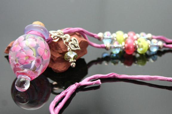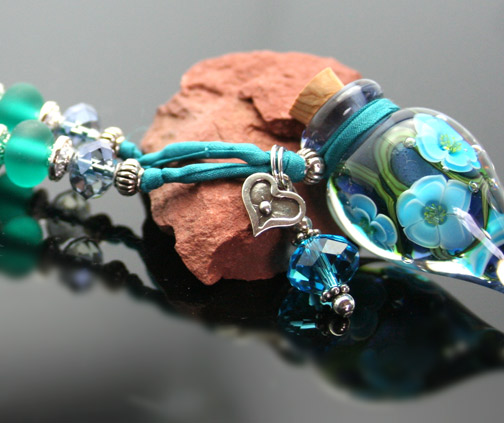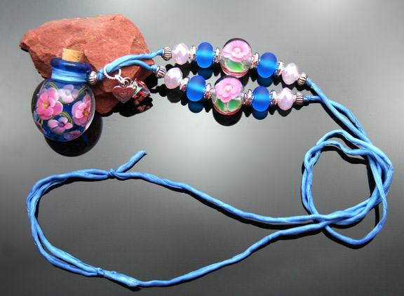 Aromatherapy Jewelry: Aromatherapy Flower Bottle Necklaces (Lampwork Glass)These incredibly beautiful and unique aromatherapy necklaces feature one-of-a-kind, hand-made lampwork glass bottles with a natural cork, pure silk cords that are hand-dyed and hand-sewn, and sterling silver, copper, or glass beads. Each necklace is simply tied at the back of the neck with 2 slip knots, so you can adjust the length of the necklace to whatever suits you. Click on each image below to see nice, big photos of each piece and to purchase.