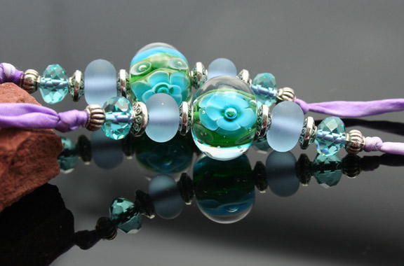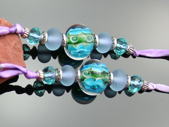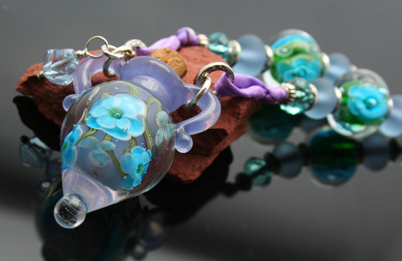 Lavender Fields Aromatherapy NecklaceThis sweet light purple aromatherapy bottle is covered in a glass layer of blue flowers and green vines. It lovingly holds your favorite essential oils in its well. Just open the 1/4" natural cork and enjoy your favorite essential oils whenever you want thoughout the day. The bottle features a matching Swarovski crystal charm, 4 zen crystal beads, 6 custom lampwork glass beads, and 12 sterling silver or silver-plated spacer beads. It hangs from a single, thin strand of satiny-soft, purple watercolor silk cord that is hand-dyed and hand-sewn. The necklace is tied at the back of the neck with 2 slip knots, so the pendant drops 15 inches (30-inches of cord) from the back of the neck to anything shorter. This very strong lampwork glass bottle has been properly kiln annealed and cleaned and is 1 5/8" long. This Aromatherapy Necklace comes in a gauze pouch with a mini-pipette to easily add essential oils to the bottle. Price: $160.80