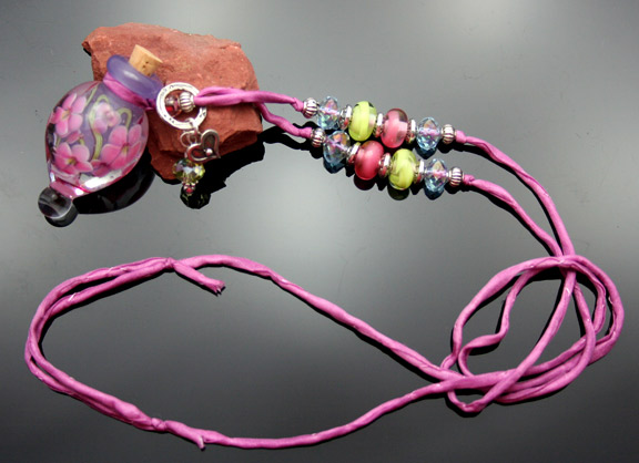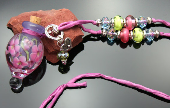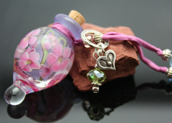 Petal Power Aromatherapy Oil NecklaceThis pretty lavender aromatherapy bottle is covered in 2 glass layers of pink flowers and light green vines. It lovingly holds your favorite essential oils in its well. Just open the 1/4" natural cork and enjoy your favorite essences whenever you want thoughout the day. The bottle features 1 Swarovski crystal charm, 4 zen crystal beads, 4 custom lampwork glass beads, a sterling silver rustic heart charm, and 11 sterling silver or silver-plated spacer beads. It hangs from a single, thin strand of satiny-soft, heather-pink pure silk cord that is hand-dyed and hand-sewn. The necklace is tied at the back of the neck with 2 slip knots, so the pendant drops 16 inches (32-onches of cord) from the back of the neck to anything shorter. The lampwork glass bottle has been properly kiln annealed and cleaned and is 1 1/5" long. This Aromatherapy Necklace comes in a gauze pouch with a mini-pipette to easily add essential oils to the bottle. Price: $148.70