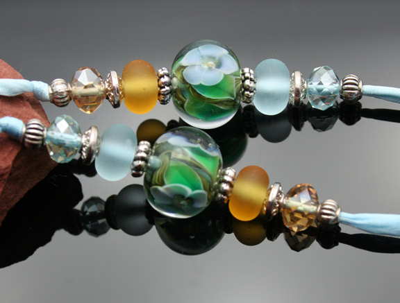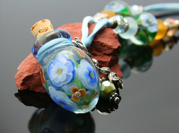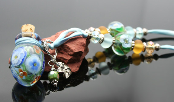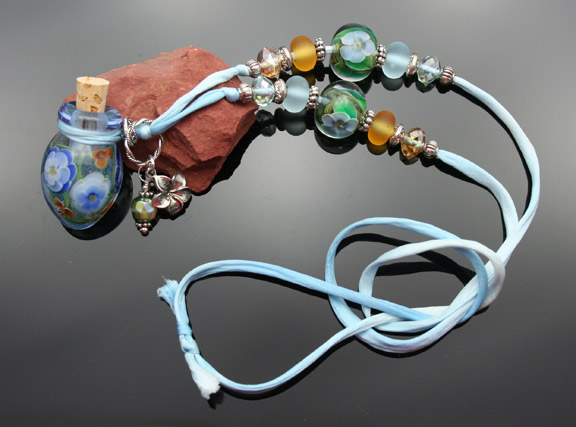 Sky Blossoms Essential Oil NecklaceThis adorable light blue aromatherapy bottle is covered in a glass layer of blue and orange flowers and green vines. It lovingly holds your favorite essential oils in its well. Just open the 1/4" natural cork and enjoy your favorite essential oils whenever you want thoughout the day. The bottle features a matching Swarovski crystal charm, a sterling silver plumaria charm, 4 zen crystal beads, 6 custom lampwork glass beads, and 13 sterling silver or silver-plated spacer beads. It hangs from a single, thin strand of satiny-soft, light blue watercolor silk cord that is hand-dyed and hand-sewn. The necklace is tied at the back of the neck with 2 slip knots, so the pendant drops 13 inches (26-inches of cord) from the back of the neck to anything shorter. This very strong lampwork glass bottle has been properly kiln annealed and cleaned and is 1 3/16" long. This Aromatherapy Necklace comes in a gauze pouch with a mini-pipette to easily add essential oils to the bottle. Price: $160.80 SOLD!