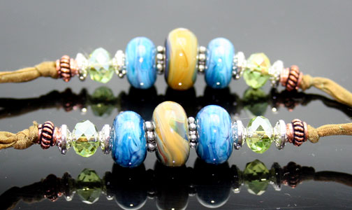 Royal blue glass with swirls of ivory, beige, and dark blue metallic describes this artisan glass aromatherapy bottle necklace. It lovingly holds your favorite essential oils in its well. Just open the 5/16" natural cork and enjoy your favorite essences whenever you want thoughout the day. The bottle features beautiful sterling silver wire work, 2 Swarovski crystals, and 26 sterling silver, copper, zen crystal, and custom lampwork glass beads. It hangs from a single strand of satiny-soft, olive green, pure silk cord that is hand-dyed and hand-sewn. The necklace is tied at the back of the neck with 2 slip knots, so you can adjust the length from 14 inches long to anything shorter. The bottle has been properly kiln annealed and cleaned and is 2 3/8" long. This Aromatherapy Necklace comes in a gauze pouch with a mini-pipette to easily add essential oils to the bottle. Price: $172.70 - Now on sale $152.70 - SOLD!