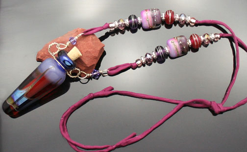 Aromatherapy Jewelry: Purple Amber PendantRich amber glass with swirls of lavender and dark blue metallic describes this artisan glass aromatherapy bottle necklace. It lovingly holds your favorite essential oils in its well. Just open the 5/16" natural cork and enjoy your favorite essences whenever you want thoughout the day. The bottle features beautiful sterling silver wire work, 2 Swarovski crystals, and 26 sterling silver, zen crystal, and custom lampwork glass beads. It hangs from a single, thick strand of satiny-soft, plum-colored, pure silk cord that is hand-dyed and hand-sewn. The necklace is tied at the back of the neck with 2 slip knots, so you can adjust the length from 15 inches long to anything shorter. The bottle has been properly kiln annealed and cleaned and is 2 3/8" long. This Aromatherapy Necklace comes in a gauze pouch with a mini-pipette to easily add essential oils to the bottle. Price: $178.80 - ONLY 1 AVAILABLE This aromatherapy necklace is one of our premium designs. It features 6 custom, lampwork glass beads that are extra-ordinary and add significant value to this piece.