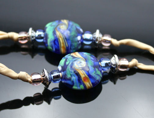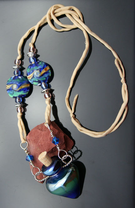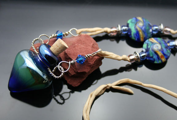 Bright royal blue glass with swirls of sea blue and silver describes this artisan glass aromatherapy bottle necklace. It lovingly holds your favorite essential oils in its well. Just open the 5/16" natural cork and enjoy your favorite essences whenever you want thoughout the day. The bottle features beautiful sterling silver wire work, 2 Swarovski crystals, and 14 sterling silver and glass beads. It hangs from a single strand of satiny-soft, ivory, pure silk cord that is hand-dyed and hand-sewn. The necklace is tied at the back of the neck with 2 slip knots, so you can adjust the length from 13.5 inches long to anything shorter. The bottle has been properly kiln annealed and cleaned and is 1 1/2" long. This Aromatherapy Necklace comes in a gauze pouch with a mini-pipette to easily add essential oils to the bottle. Price: $124.70 - ONLY 1 AVAILABLE - SOLD