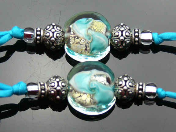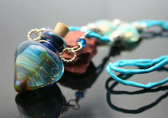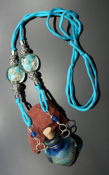 Mesmerizing aquatic blue and clear glass with swirls of ivory and a touch of sea green describes this artisan glass aromatherapy bottle necklace. It lovingly holds your favorite essential oils in its well. Just open the 5/16" natural cork and enjoy your favorite essences whenever you want thoughout the day. The bottle features beautiful sterling silver wire work, 2 Swarovski crystals, and 14 sterling silver and glass beads. It hangs from a single strand of satiny-soft, turquoise, pure silk cord that is hand-dyed and hand-sewn. The necklace is tied at the back of the neck with 2 slip knots, so you can adjust the length from 15 inches long to anything shorter. The bottle has been properly kiln annealed and cleaned and is 1 1/2" long. This Aromatherapy Necklace comes in a gauze pouch with a mini-pipette to easily add essential oils to the bottle. Price: $134.70 - ONLY 1 AVAILABLE