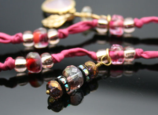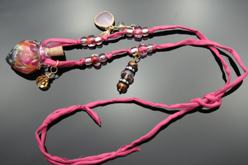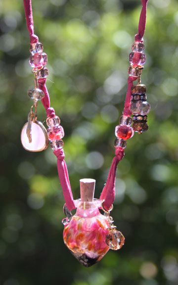 Aromatherapy Jewelry: Gold Coral "Mini" Aroma Treasure NecklaceA beautiful, organic pattern of pink, cream, gold and black graces this petite, hand-blown, lampwork glass, aromatherapy bottle necklace. It lovingly holds your favorite essential oils in its well. Just open the natural cork and enjoy your favorite essences whenever you want thoughout the day. The bottle features gold and gold-plated findings, Czech glass crystal beads, 1 Swarovski crystal dangle, and 4 beautiful, custom-made, lampwork, glass beads. There is also a Glass Fancy Stone (Pink Opal) Pendant, 16K Gold Framed. It hangs from a super-soft strand of satiny-soft, strawberry-pink, pure silk cord that is hand-dyed and hand-sewn. The necklace is tied at the back of the neck with 2 slip knots, so you can adjust the length from 14 inches long to anything shorter. The bottle has been properly kiln annealed and cleaned and is 1" long. This Aromatherapy Necklace comes in a gauze pouch with a mini-pipette to easily add essential oils to the bottle. Price: $148.70 - Now on Sale $128.70 - SOLD This aromatherapy necklace is one of our premium designs. It features 4 custom, lampwork glass beads that are just lovely!