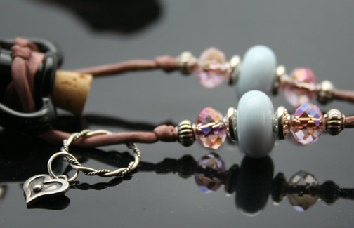 Aromatherapy Jewelry: Cotton Candy Essential Oil NecklaceSoft, swirling dots of light pink, cream, and lavender gracefully sit below a striking black glass top... This pretty, lampwork glass, aromatherapy bottle necklace lovingly holds your favorite essential oils in its well. Just open the natural cork and enjoy your favorite essences whenever you want thoughout the day. The bottle features beautiful sterling silver beads and findings, 1 sterling silver heart charm, zen crystal beads, and 2 custom-made, lampwork, glass beads. It hangs from a super-soft strand of satiny-soft, taupe, pure silk cord that is hand-dyed and hand-sewn. The necklace is tied at the back of the neck with 2 slip knots, so you can adjust the length from 15 inches long to anything shorter. The bottle has been properly kiln annealed and cleaned and is 1 1/2" long. This Aromatherapy Necklace comes in a gauze pouch with a mini-pipette to easily add essential oils to the bottle. Price: $119.80 - ONLY 1 AVAILABLE! This aromatherapy necklace is one of our premium designs. It features 4 custom, lampwork glass beads that are exquisite!