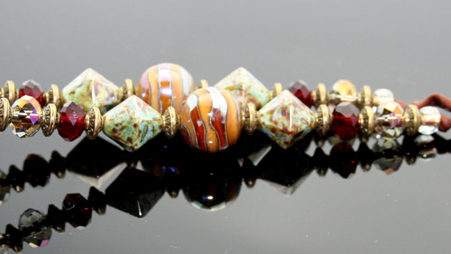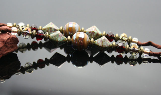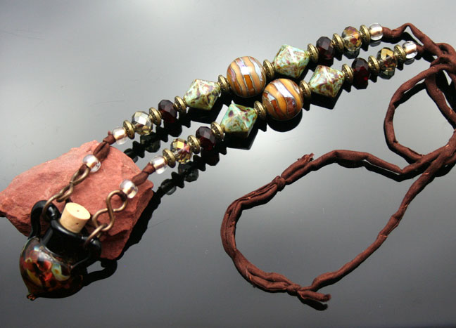 Aromatherapy Jewelry: Earthy and Elemental Aroma NecklaceSwirling dots of pink, blue, and light green glass decorate this stunning, lampwork glass, aromatherapy bottle necklace with a solid black glass top. Just pour your favorite essential oils in its well and open the natural cork to enjoy your favorite essences whenever you want thoughout the day. The bottle features beautiful brass beads and findings, 8 zen crystal glass beads, 4 Czech glass beads and 2 beautiful, custom-made, lampwork, glass beads. It hangs from a super-soft strand of satiny-soft, brown, pure silk cord that is hand-dyed and hand-sewn. The necklace is tied at the back of the neck with 2 slip knots, so you can adjust the length from 13 inches long to anything shorter (26 inches of cord, total). The bottle has been properly kiln annealed and cleaned and is 1 1/2" long. This Aromatherapy Necklace comes in a gauze pouch with a mini-pipette to easily add essential oils to the bottle. Price: $138.70 - ONLY 1 AVAILABLE!- SOLD