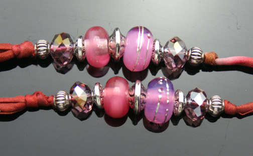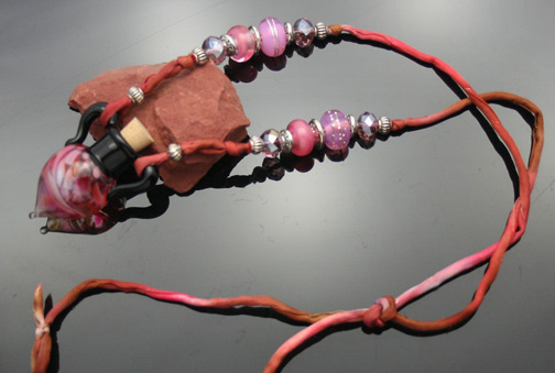 Aromatherapy Jewelry: Pink Sunset Essential Oil NecklaceSwirling dots of pink, cream, and apricot gracefully sit below a striking black glass top... This stylish, lampwork glass, aromatherapy bottle necklace lovingly holds your favorite essential oils in its well. Just open the natural cork and enjoy your favorite essences whenever you want thoughout the day. The bottle pendant features beautiful sterling silver spacer beads, 4 zen crystal glass beads, and 4 beautiful, custom-made, lampwork, glass beads. It hangs from a super-soft strand of satiny-soft, sunset-watercolor, pure silk cord that is hand-dyed and hand-sewn. The necklace is tied at the back of the neck with 2 slip knots, so you can adjust the length from 13 inches long to anything shorter. The bottle has been properly kiln annealed and cleaned and is 1 1/2" long. This Aromatherapy Necklace comes in a gauze pouch with a mini-pipette to easily add essential oils to the bottle. Price: $119.80 - ONLY 1 AVAILABLE!
