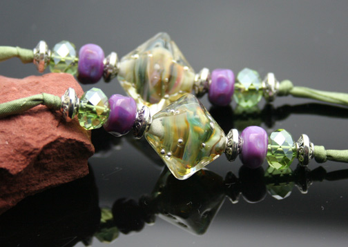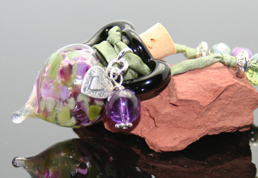 Glass Aromatherapy Jewelry: Purple Sage Aroma Pendant - SOLDSwirling dots of sage green and lavender gracefully sit below a striking black glass top... This gorgeous, lampwork glass, aromatherapy bottle necklace lovingly holds your favorite essential oils in its well. Just open the natural cork and enjoy your favorite essences whenever you want thoughout the day. The bottle features beautiful sterling silver beads and findings,zen crystal glass beads, 1 sterling silver heart charm, 1 Swarovski amethyst crystal dangle, and 6 beautiful, custom-made, lampwork, glass beads. It hangs from a super-soft strand of satiny-soft, sage green, pure silk cord that is hand-dyed and hand-sewn. The necklace is tied at the back of the neck with 2 slip knots, so you can adjust the length from 14 inches long to anything shorter. The bottle has been properly kiln annealed and cleaned and is 1 1/2" long. This Aromatherapy Necklace comes in a gauze pouch with a mini-pipette to easily add essential oils to the bottle. Price: $152.70 - ONLY 1 AVAILABLE! This aromatherapy necklace is one of our premium designs. It features 6 custom, lampwork glass beads that are exquisite!