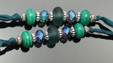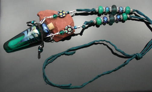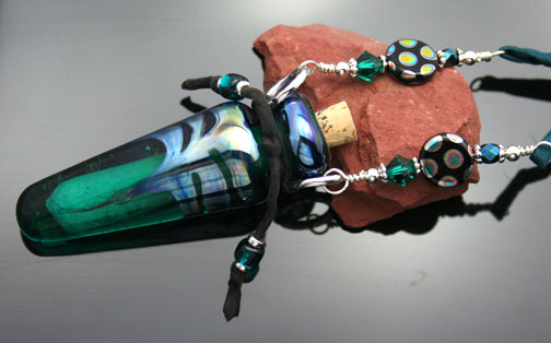 Deep green, transparent glass with swirls of silver blue metallic describes this artisan glass aromatherapy bottle necklace. It safely holds your favorite essential oils in its well. Just open the 5/16" natural cork and enjoy your favorite essences whenever you want thoughout the day. The bottle features beautiful sterling silver findings, 2 Swarovski crystals, and 28 sterling silver, zen crystal, and glass beads. It hangs from a single, thin strand of satiny-soft, forest green, pure silk cord that is hand-dyed and hand-sewn. The necklace is tied at the back of the neck with 2 slip knots, so you can adjust the length from 14 inches long to anything shorter. The bottle has been properly kiln annealed and cleaned and is 2 3/8" long. This Aromatherapy Necklace comes in a gauze pouch with a mini-pipette to easily add essential oils to the bottle. Price: $188.70 - Now on Sale $168.70 - SOLD